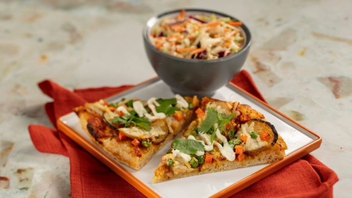 …Curry Spice Pizza, topped with carrots, potato, peas, and lime “yogurt” (which appears to be plant-based)…