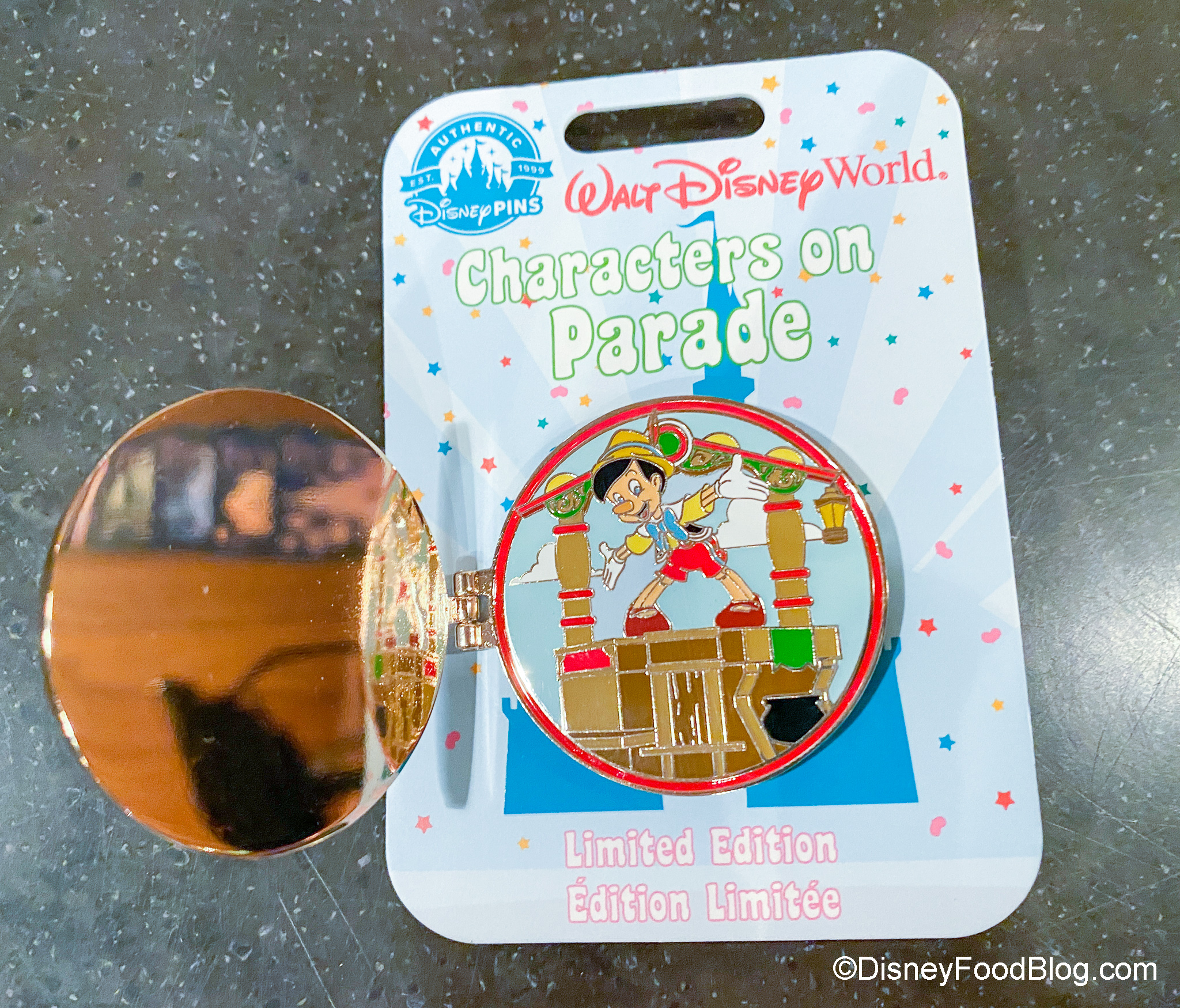 The Pinocchio Pin opens up to reveal a Pinocchio scene!