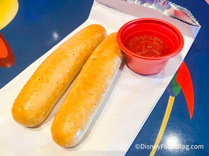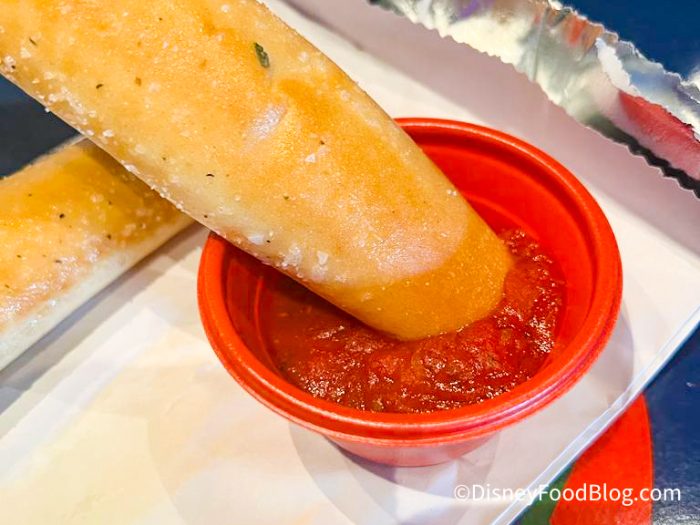 Now, we’re certainly not writing home about these breadsticks, but if ya eat ’em while they’re warm they’re a good compliment to your pasta, pizza, or salad. We would have loved to have some more marinara sauce to work with (the cup was about half full), but they get the job done.