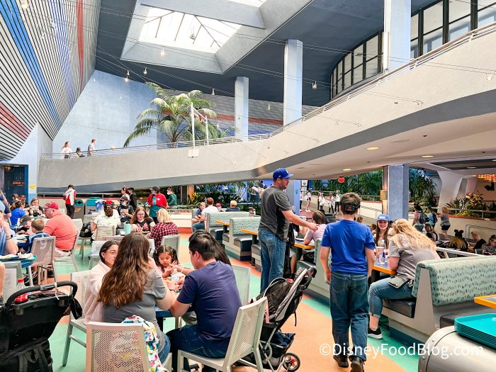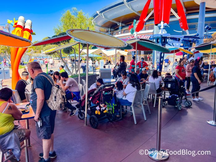 And, if you’d prefer to soak in some fresh air, there’s also outdoor seating that has some shading and faces Space Mountain.