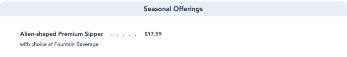 The drink offerings here are pretty standard (despite their super fun name — “Lunar Liquids”) with things like fountain drinks, water, milk, coffee, and tea available. And, if you’d like something that you can take along with you, there’s a Travel Mug, Souvenir Sipper, and even a Reusable Cutlery Set available for purchase.