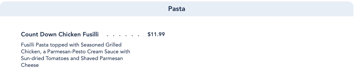 The menu here is pretty straightforward, with the same offerings available for both lunch and dinner. If you’re looking for pasta, your only option will be the Count Down Chicken Fusilli…