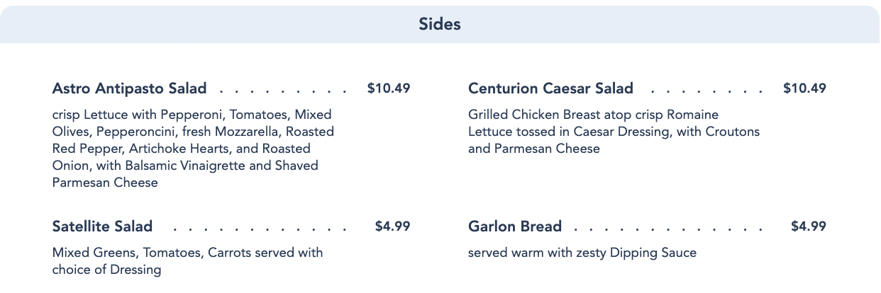 To make it a full meal, there are three different salads (though the Astro Antipasto Salad and Centurion Caesar Salad are a bit bigger portion-wise) plus Garlon Bread (which is like garlic bread).