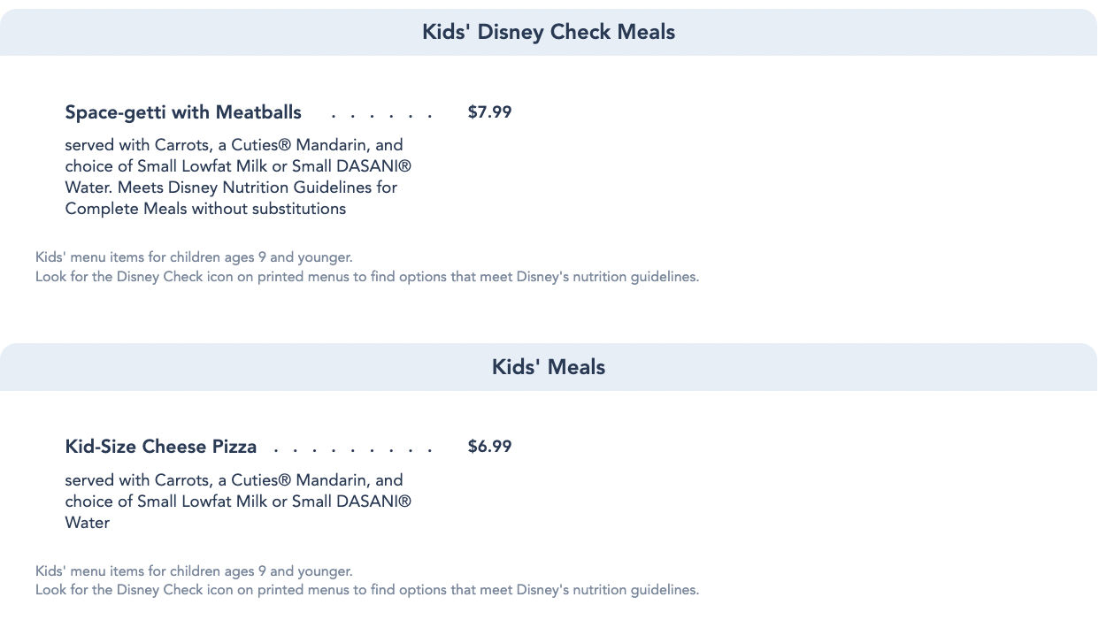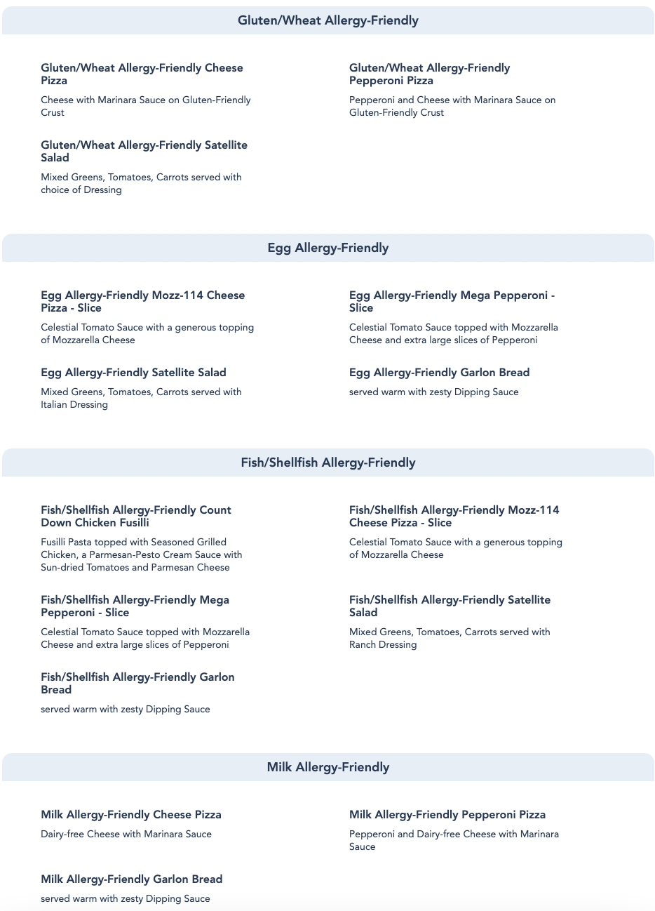 If you’ve got kiddos, they can choose from the Space-getti with Meatballs or the Kid-Size Cheese Pizza. Each is served with Carrots, a Cuties Mandarin, and choice of Small Lowfat Milk or Small Dasani Water.