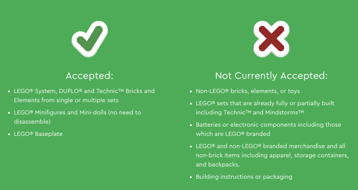 You don’t even need to clean your LEGOs before you donate — they will sort and clean the bricks you send back before they donate them. Just don’t send back any damaged or broken LEGOs! You also don’t have to worry about if you’re missing pieces from a set. Here’s a look at what is and is not accepted by the program: