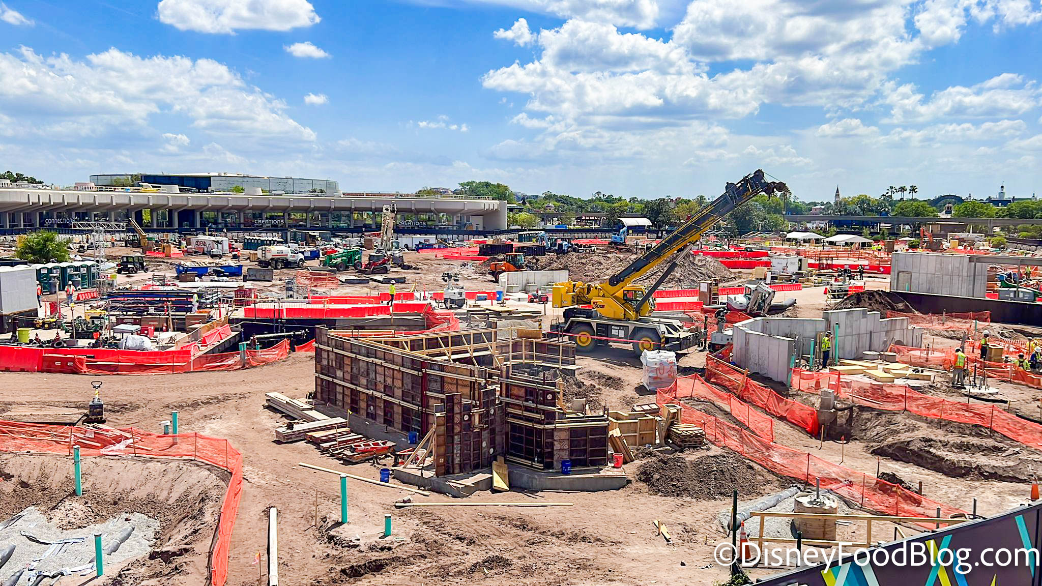 Opening before Guardians will be the new restaurant in World Celebration, Connections Cafe and Eatery. This week we got the full menu for this new spot, but we also spotted some construction updates!