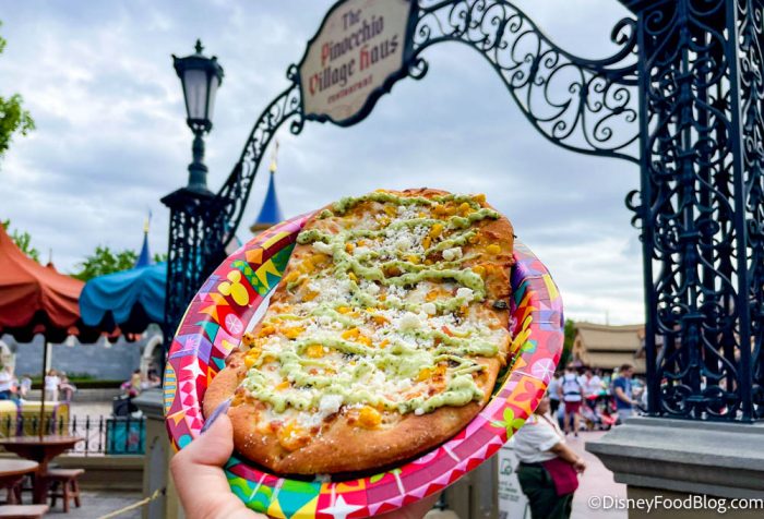 We thought this flatbread was delicious! It can be tough to find unique flavors in Magic Kingdom sometimes, but this snack definitely fits that bill. The cilantro mayo was very herbaceous, and it added some great flavor. The Mozzarella cheese was perfectly melted, and the queso fresco was a cool, fresh addition to balance out the heavier sauce and cheese. The roasted corn added a little bit of smokiness, but mostly you just got a burst of sweetness from each piece.