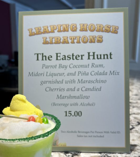 We first visited Leaping Horse Librations, the pool bar located at Disney’s BoardWalk Inn. The new featured April drink is The Easter Hunt, made with Parrot Bay Coconut Rum, Midori Liqueur, and Pina Colada Mix for $15. The sign says the drink is garnished with Maraschino Cherries, but our garnishments were Jelly Beans and a Peep.