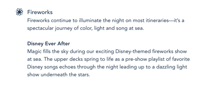 While we’re still waiting for an update on a few cruise activities, like the Sail Away Celebration and the Pirate’s Night deck party, we did notice that Disney has a new section on its website with updated language on the fireworks.