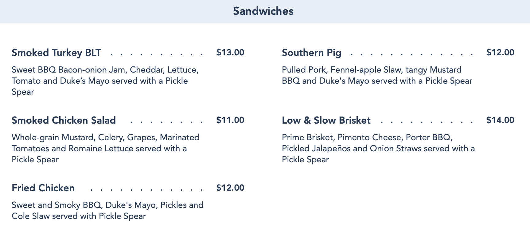 Sandwich prices begin at $11, with the Smoked Chicken Salad, to $14, for the Low & Slow Brisket.