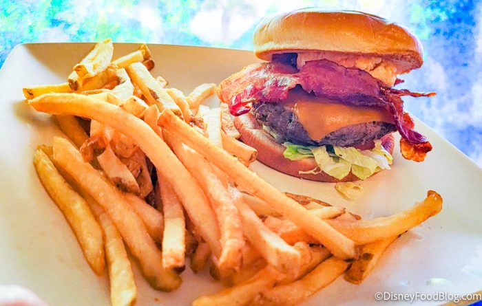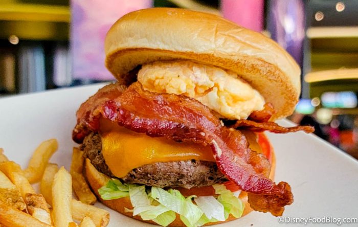 This burger is a Grilled Signature-blend Burger topped with Bacon, Pimento Cheese, Lettuce, and Tomato on a Toasted Brioche Bun, and it’s also served with French Fries.