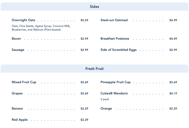 There are also some sides available, like bacon, sausage, and potatoes. And you can grab fresh fruit for a healthy morning snack!