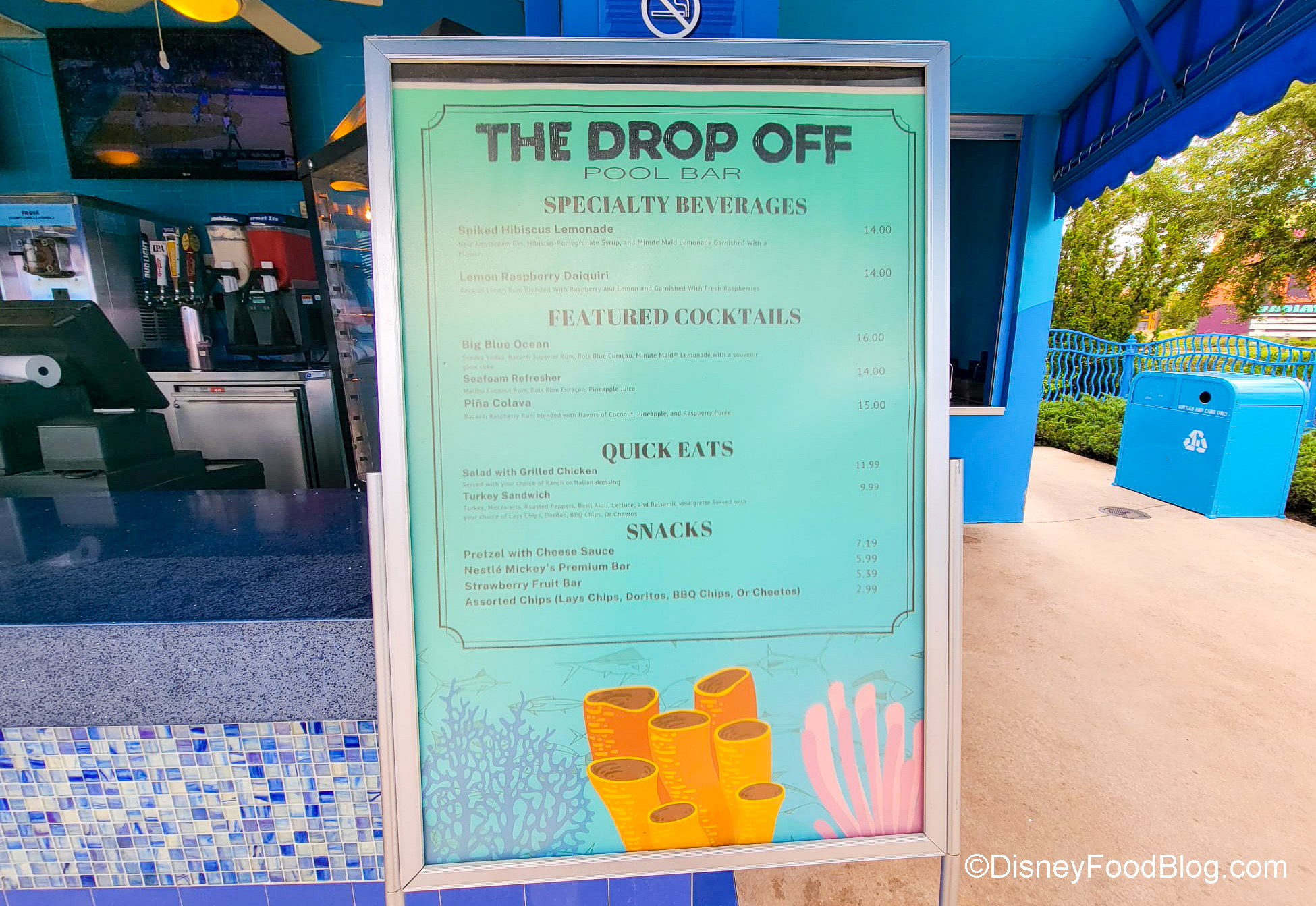 We found this refreshing drink at The Drop Off Pool Bar at Disney’s Art of Animation Resort. Although the menu posted at the bar had the drink listed as $14, we were only charged $12 when we ordered it.