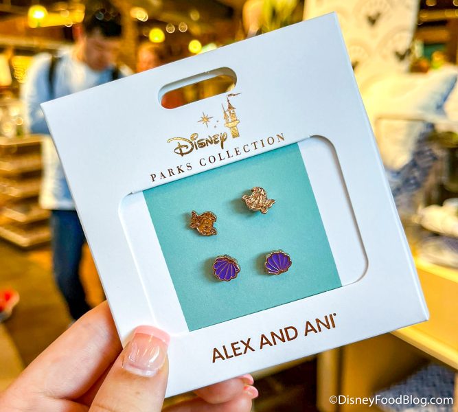 Next, we have and earrings set featuring Flounder and some purple clam shells from The Little Mermaid!