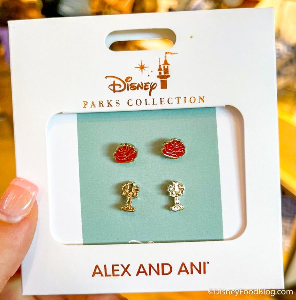 Now, let’s take a look at what we found from the collection over at World of Disney in Disney Springs. First up, we have this Beauty and the Beast earrings set featuring Lumiere and some lovely red roses.