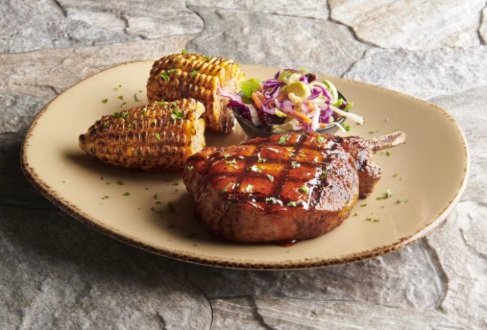 The Maple Bourbon Pork Chop comes with double thick bone-in grilled pork chop, maple bourbon BBQ sauce, grilled corn, and apple-cranberry brussel slaw.