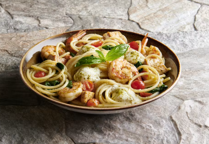 The Mediterranean Chicken and Shrimp Pasta comes with sautéed chicken and shrimp tossed with lemon basil pesto, spinach, burrata cheese, heirloom cherry tomatoes, and bucatini pasta.