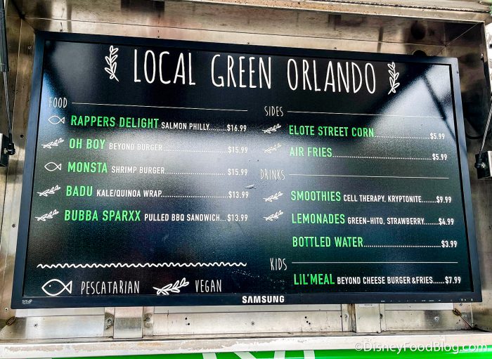 A brand new food truck has moved into Disney Springs. It’s called the Local Green Orlando and it specializes in vegan, vegetarian, and pescatarian food. The menu starts with “Entrees:”