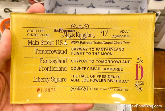 And, lastly, the highly-prized “E” Ticket, was good for the most popular rides including “it’s a small world,” 20,000 Leagues Under The Sea, The Mickey Mouse Revue, Jungle Cruise, Tropical Serenade, and The Haunted Mansion. This tray is the smallest in the set but is more square-shaped versus rectangular like the A Ticket plate.