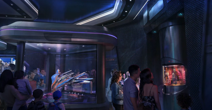 According to Imagineer Zach Riddley, “Angular designs, striking use of colors, and materials all help tell the story of a Nova Corps facility. The railings, station gates and floor markings…are all used to convey the experience in ways that might not be as obvious or apparent, but every detail is a choice that supports our story.”