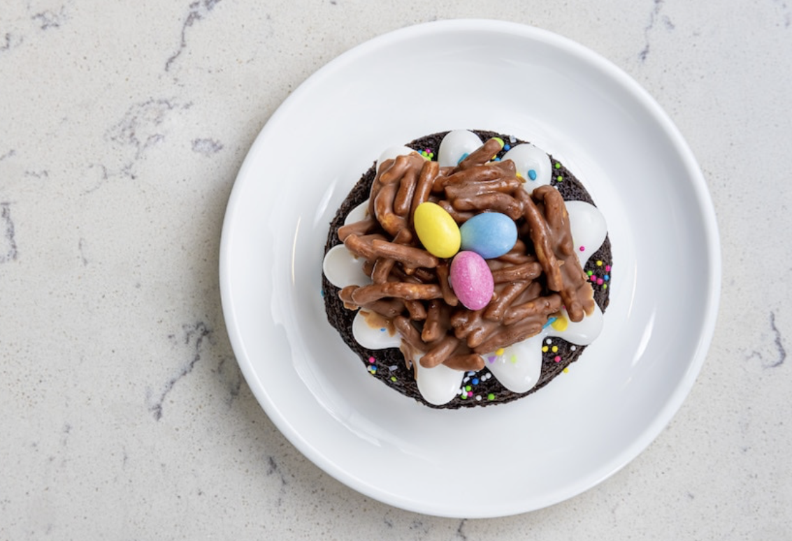 - Spring Birds Nest Donut: Chocolate sponge cake donut glazed and garnished with a crunchy chocolate nest and sugar eggs (New)