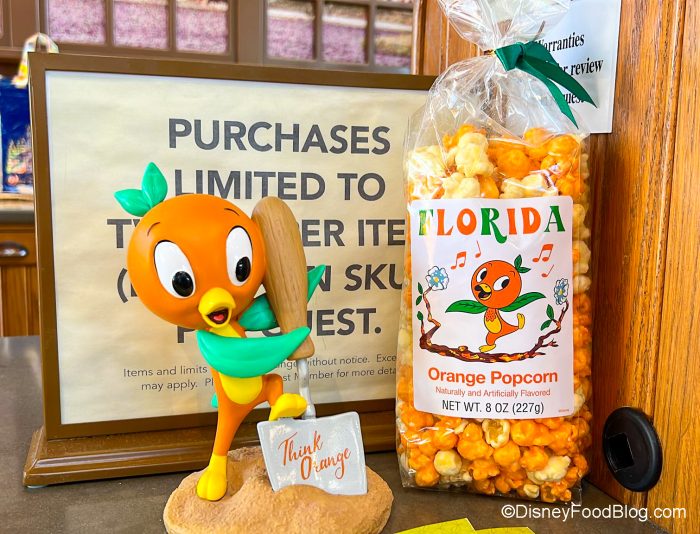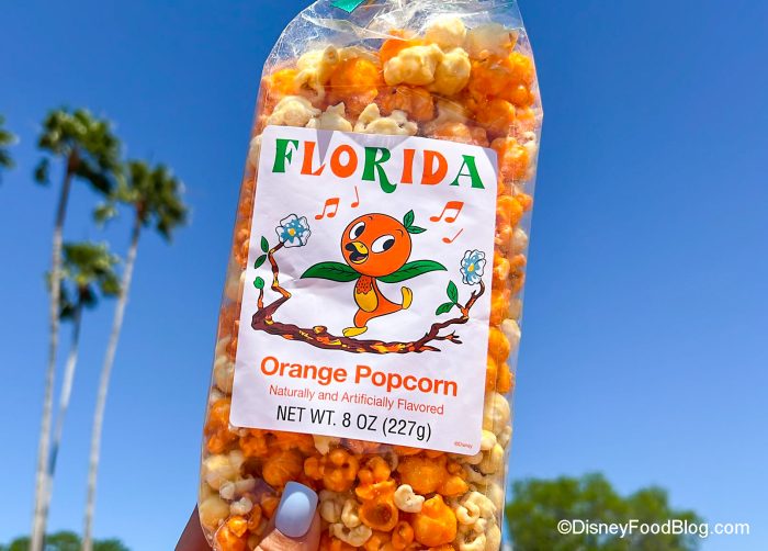 You can now grab a bag of Florida Orange Popcorn at EPCOT, and yes, Orange Bird is right there on the label. But…Orange Popcorn, folks — you can’t make that up.