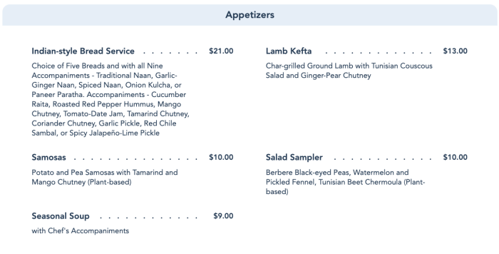 - You’re a picky eater — We like to recommend reading over most Disney World menus before booking a reservation, but that advice is especially important at Sanaa. The menu here consists mainly of African and Indian-inspired dishes, so if you prefer a simple burger and fries, you might want to check out another restaurant.
