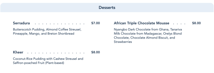 We’ve got even MORE entrees to try, so next up is the new Zanzibari Vegetable Curry for $22. This is served with Seasonal Vegetables with Fragrant Rice. As the name implies, this dish is perfect for guests looking for a vegetable-based dish and caters to those with gluten, wheat, egg, fish, shellfish, milk, or peanut allergies.