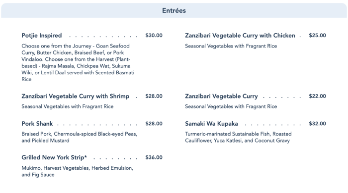 The entree menu is full of African and Indian-style dishes as well! Today, we’re going on a journey with the Potjie Inspired entree, which lets guests select both a protein and an additional dish.Â