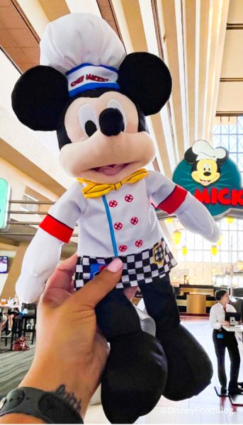 Chef Mickey wears his iconic Chef Mickey hat, yellow neckerchief, chef jacket, and checkered apron — with pops of red and blue of course (we love how these accents remind us of the Chef Mickey’s sign)!