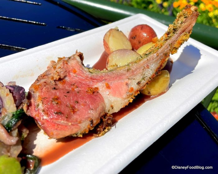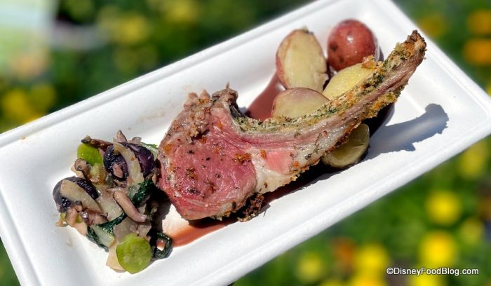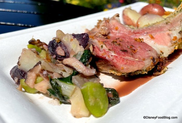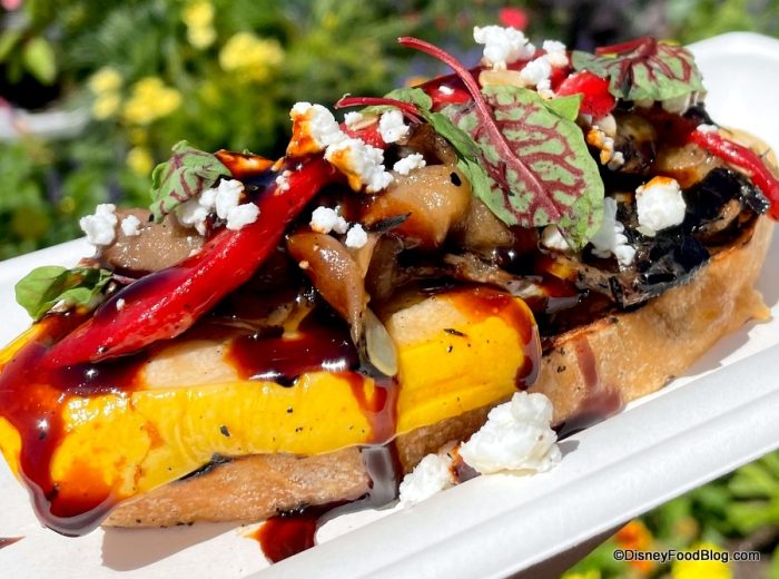 We started out with the new Grilled Vegetable Bruschetta, which has marinated peppers, zucchini, squash, artichokes, goat cheese, and balsamic glaze on grilled ciabatta bread. This dish is $5. Okay, first, we’re going to need Disney to give us this recipe because this is a new favorite from the festival! It’s so fresh, bright, and SO very spring. We also love that hint of zing that the balsamic adds, along with the creaminess of the goat cheese.