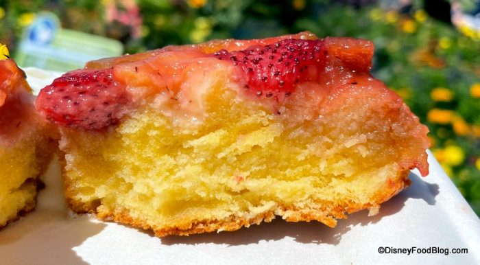 The cake is nearly perfect — just a nice simple moist cake. We also liked the slight crunch on the bottom of it. The flavor here we got the most was vanilla, which balances with the fruit on top.