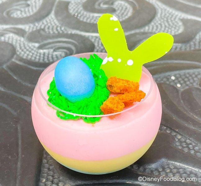This new Easter treat can be found at Amorette’s Patisserie in Disney Springs. It’s the Hopping Parfait, and we’re just going to say this — this snack will look GREAT on your social media page. Look at all these pastel colors — it’s almost TOO pretty to eat! That’s where the difficulty with this treat came in: It looks so perfect that we really don’t want to mess up those pretty layers!