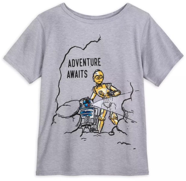 The shirt features R2-D2 and C-3PO peering around some rocks with the words “Adventure Awaits” above them. It’s a cute tee for a day at Star Wars: Galaxy’s Edge, but what caught our team’s eye today was the little sticker on it.