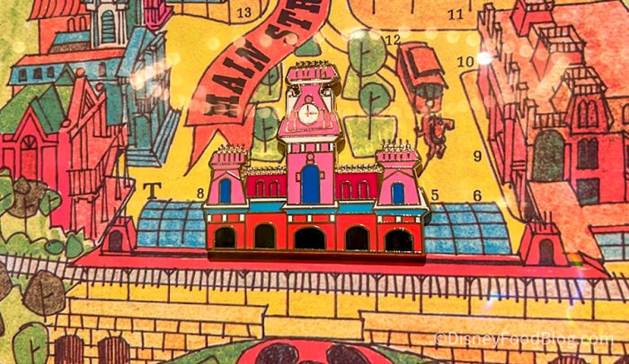 Specifically, you can get a version of the map that is framed and contains a series of pins of Magic Kingdom landmarks! Here’s the pin for the Walt Disney World Railroad station on Main Street.