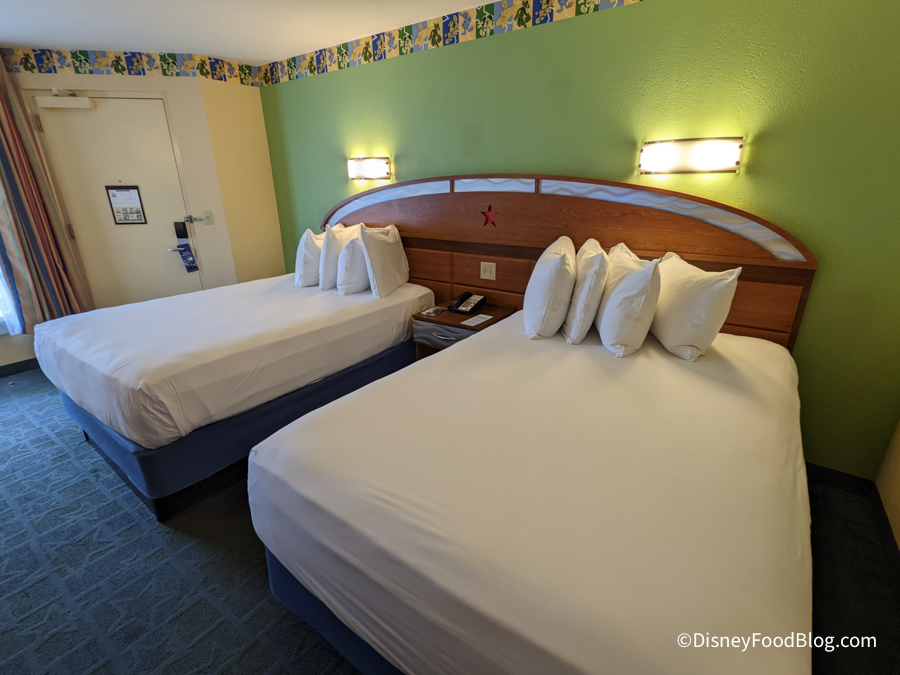 We recently took a look inside one of the standard rooms at All-Star Sports, so here’s a tour of the room! This room is located in the Surf’s Up! section of the hotel that is all about surfing! The standard rooms feature two double beds with a view of the courtyard, pool, or parking lot.