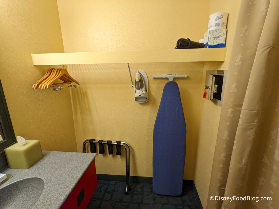 To the right of the sink, is a small closet-type area that features some hangers, extra storage space, and some other amenities, like an ironing board and hair dryer.