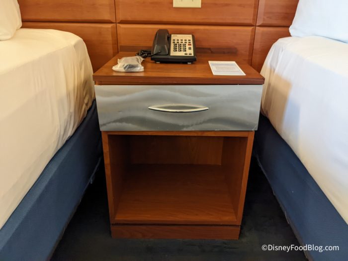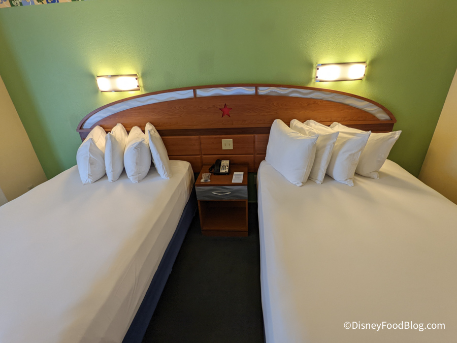 Each bed had four pillows each and the standard Disney bedding. The table between the two beds held a phone, the sanitized TV remote wrapped in plastic, and some information about how to keep yourself safe and your personal information confidential when staying at a hotel.