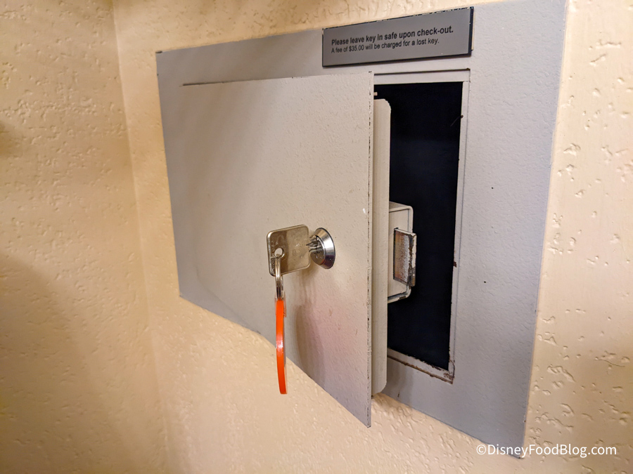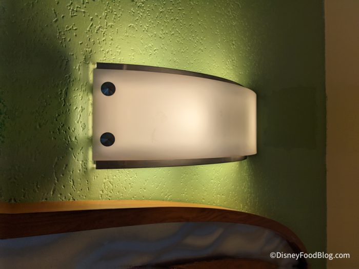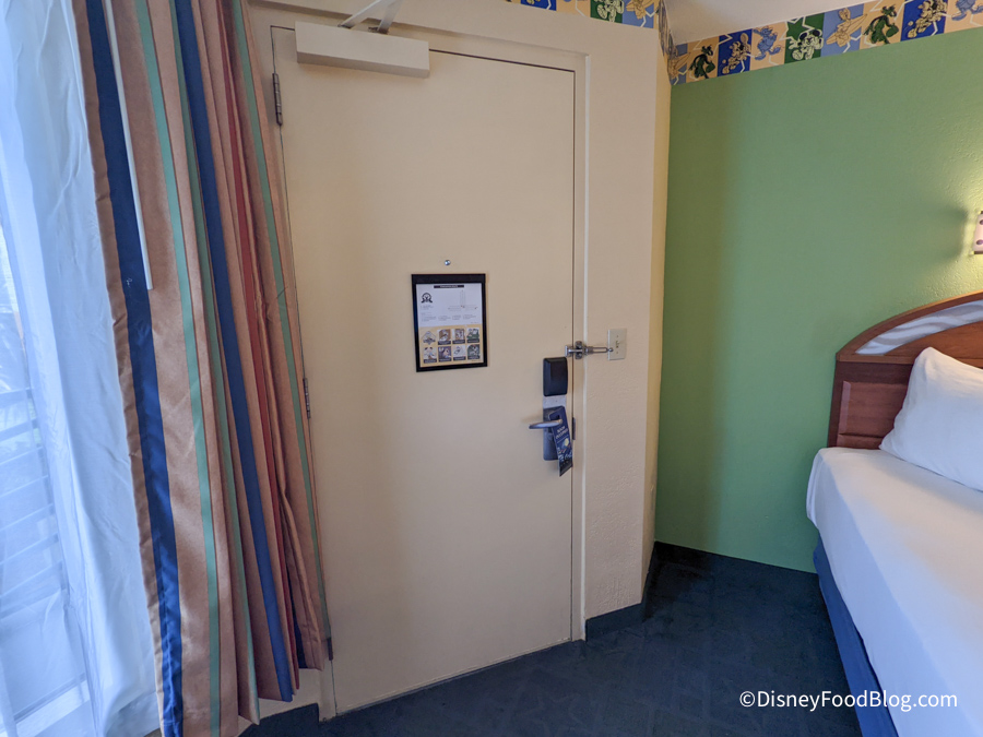 The door to the room opens up onto an outdoor hallway and includes the standard door handle, deadbolt, and security guard. There was also an “Off to Neverland” hang tag on the door so you can let Cast Members know you’re in your room and to not disturb.