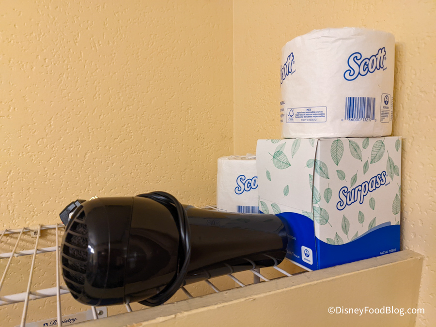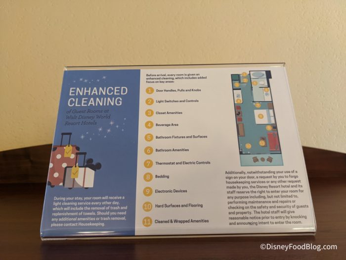 The TV cabinet held the television (of course), along with a mini fridge and three drawers. There were also shelves on either side of the cabinet for additional storage. On top of the cabinet was information about Disney’s enhanced cleaning measures.