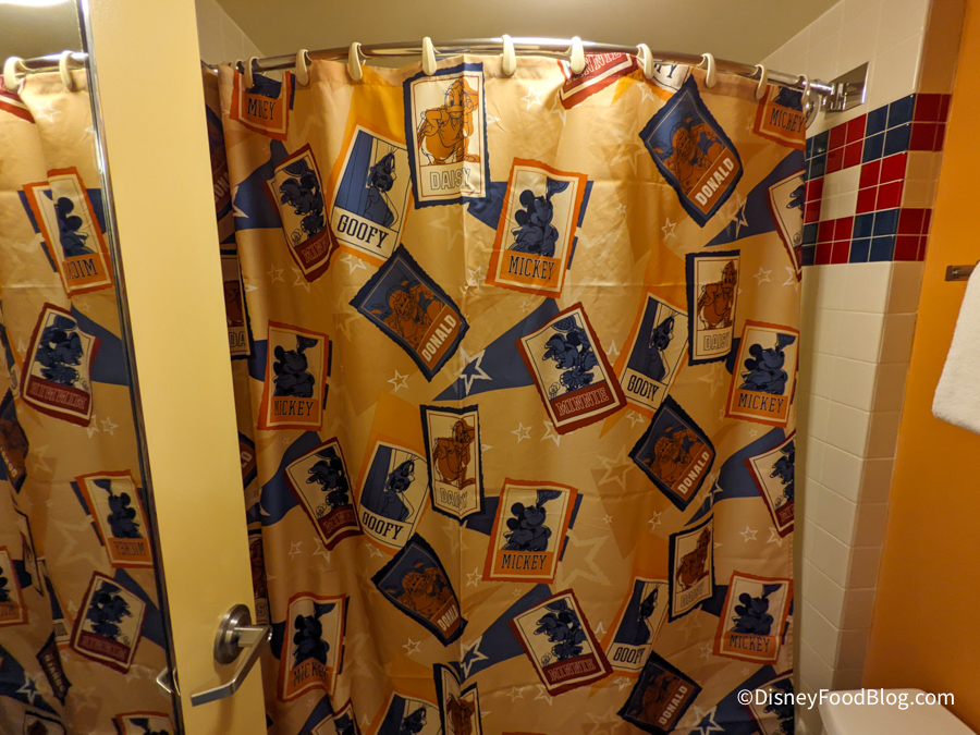 The tile on both the floor and in the shower is checkered, and the shower curtain features Mickey and other characters playing sports.
