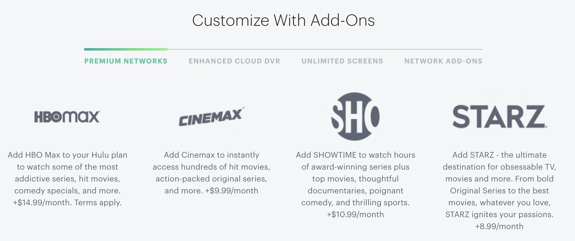 So, if you haven’t caught on already, you could end up paying A LOT more for Hulu + Live TV than you originally anticipated if any of the add-ons are important to you. There are currently four different options that you can tack onto your subscription including Premium Networks (ranging from $8.99-$14.99/month), Unlimited Screens ($9.99/month), and other Network Add Ons (Español Add-on for 4.99/month, Entertainment Add-on for $7.99/month, and Sports Add-on for $9.99/month).