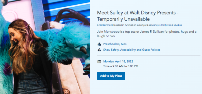 Hollywood Studios is showing times to meet Sulley from Monsters Inc. starting on Monday, April 18th! Over at Walt Disney Presents, you can meet the best scarer in Monstropolis! According to the Disney website, he’s meeting throughout the day from 9AM until 5PM.