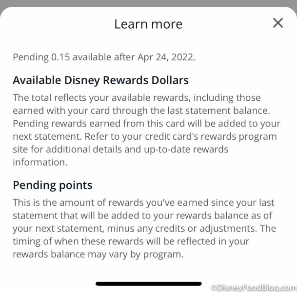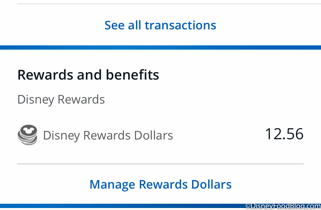 In the app, it’ll show you your “Disney Rewards Dollars.” You can hit “Manage Rewards Dollars” to see more information. When you do that, it’ll show you how many dollars you have and what’s pending. You can also see certain details on the Disney Rewards website.