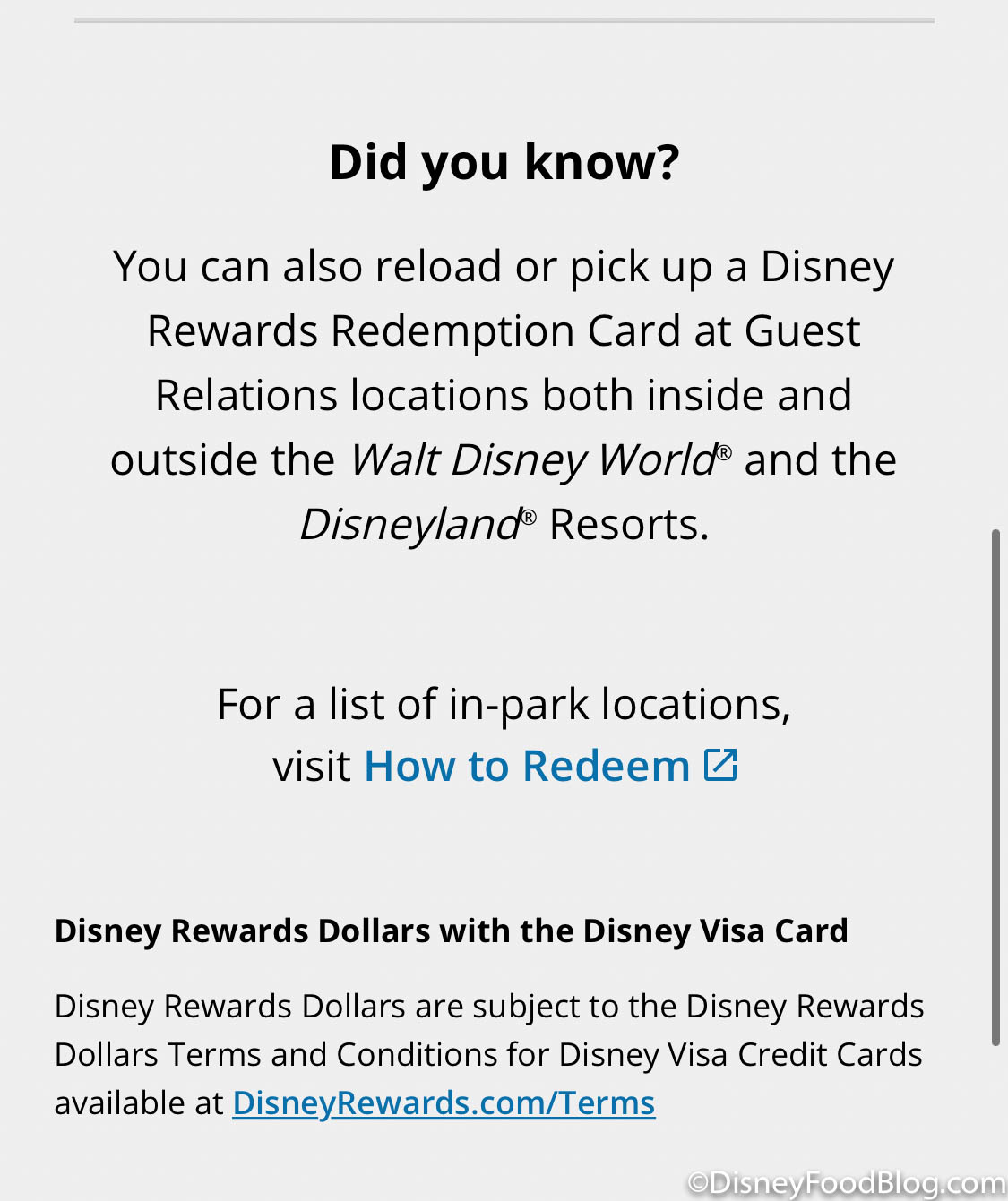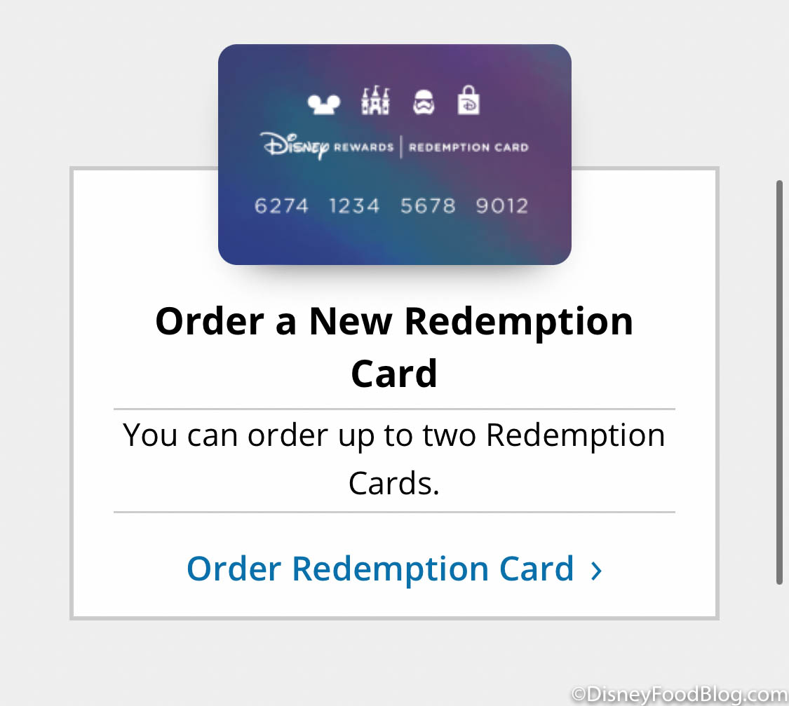 You can also check to see the balance on your Disney Rewards Redemption Card, reload the balance of this card, and request another card if needed. You can have 2 Redemption Cards per account.