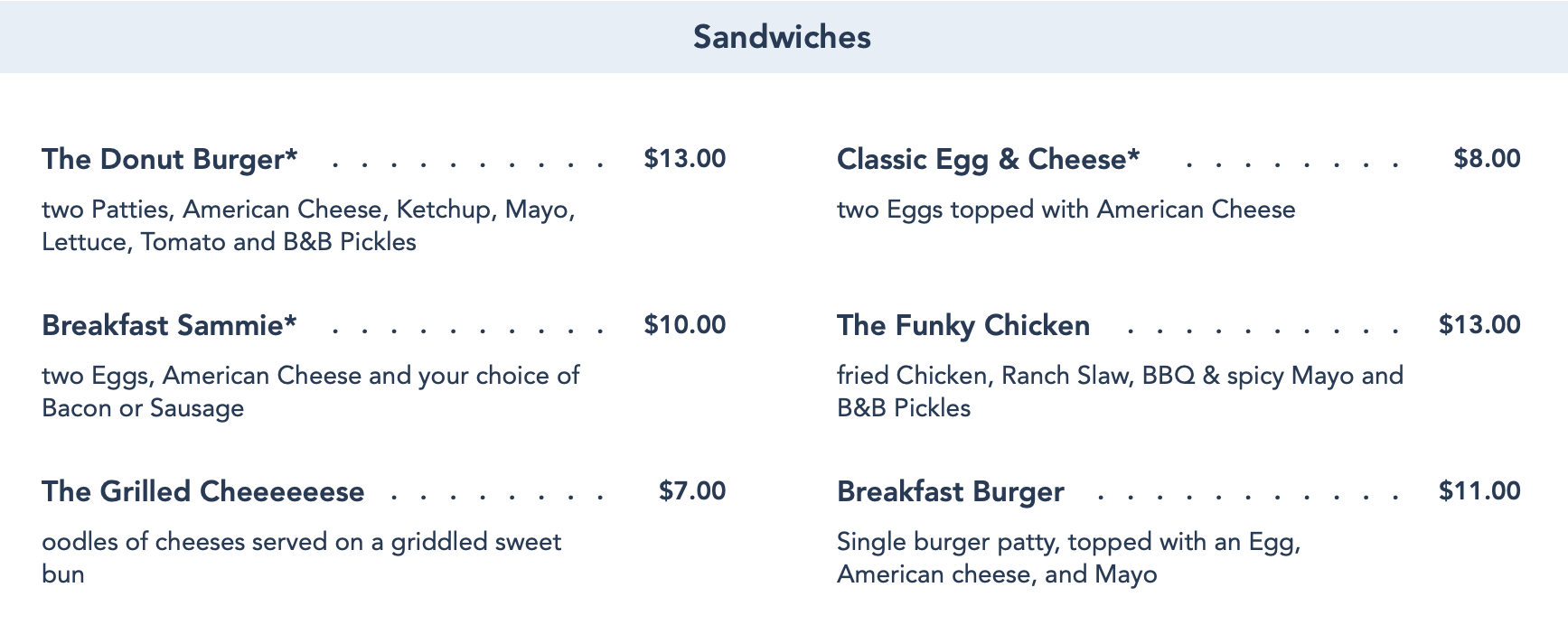 And at Everglazed, you’ll also find sandwiches for $7-$13 each! You can choose from burger options, breakfast sandwiches, a chicken sandwich, and the famous Grilled Cheeeeeese.