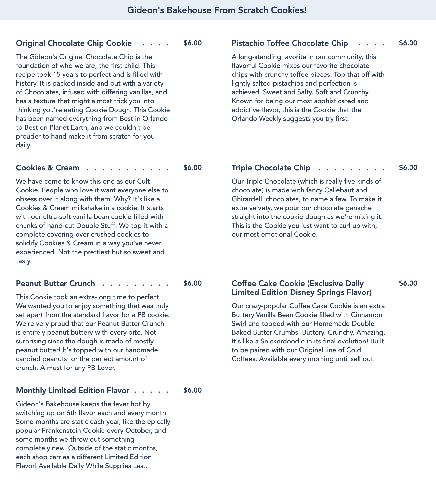 At Gideon’s Bakehouse, you can get one of their made-from-scratch cookies for $6, and your choices include their Original Chocolate Chip Cookie, Pistachio Toffee Chocolate Chip, Cookies & Cream, Triple Chocolate Chip, Peanut Butter Crunch, and a specialty Monthly Limited Edition Flavor, which changes every month. The Coffee Cake Cookie is available daily exclusively in Disney Springs, while it’s only available once a year at the original Gideon’s Bakehouse.