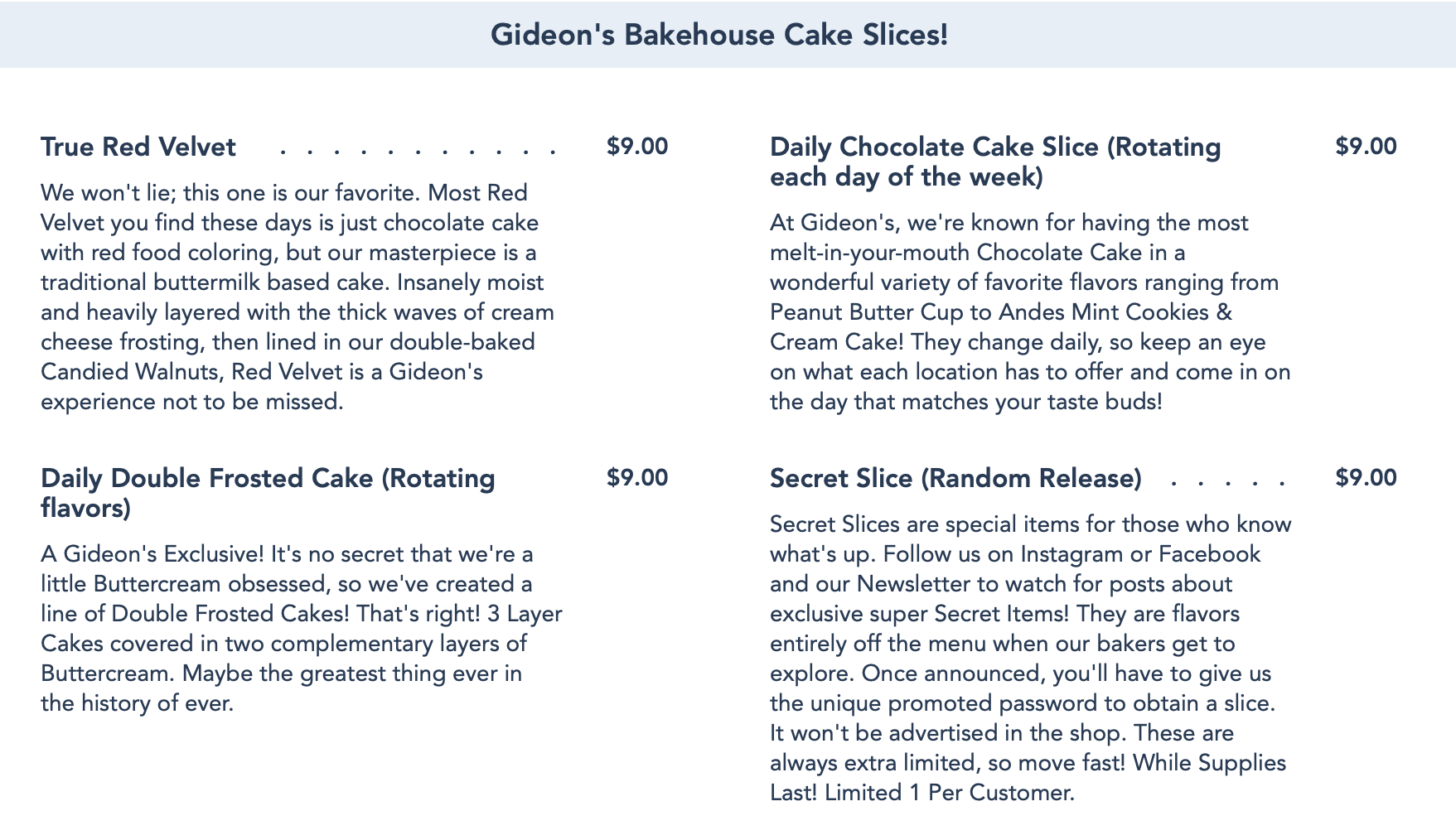 Cake slices are $9 each at Gideon’s, and the core flavor is the True Red Velvet. There’s also a Daily Chocolate Cake that changes daily, a Daily Double Frosted Cake with rotating flavors, and a Secret Slice that randomly pops up AND you need a password to buy it!