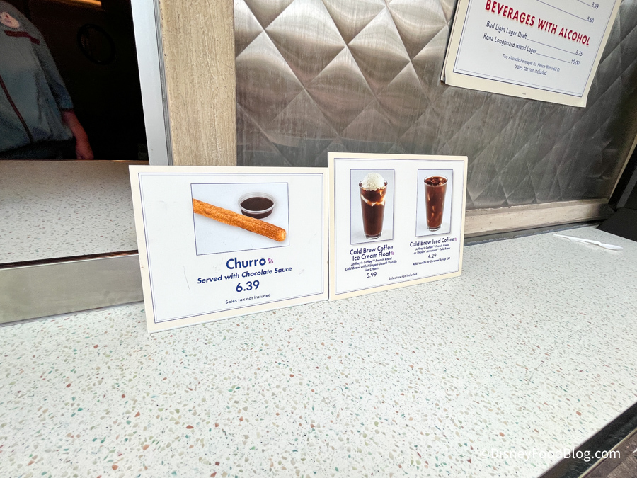 The churro is $6.39 and comes with chocolate dipping sauce.