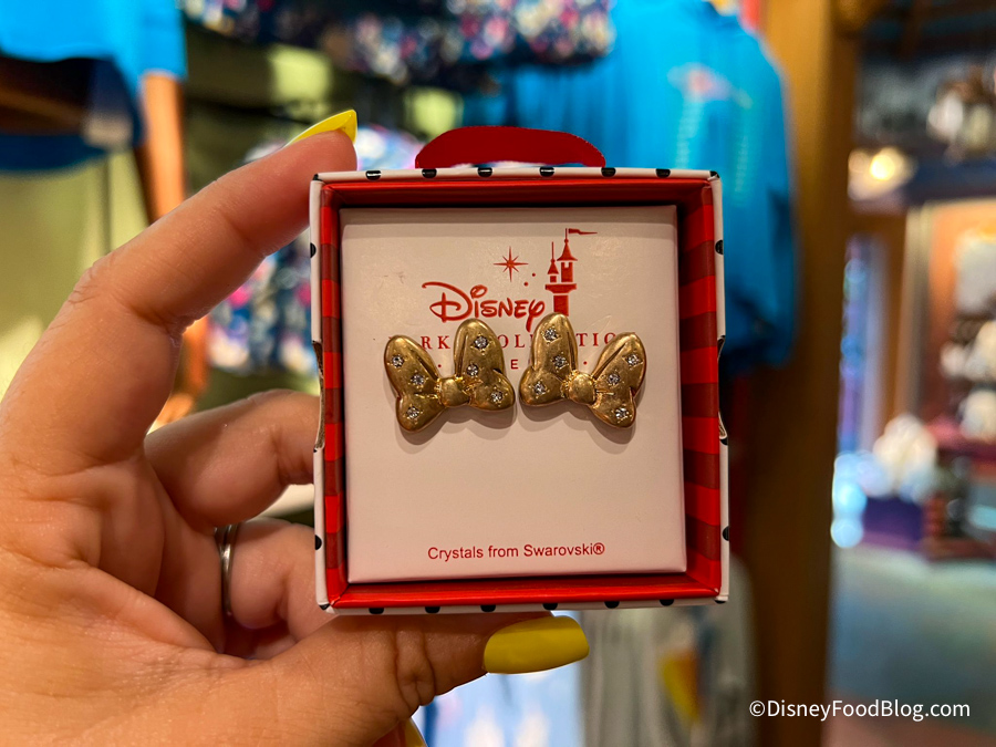 We also spotted two new pairs of earrings! The first pair are these gold Minnie Mouse bows studded with crystals.